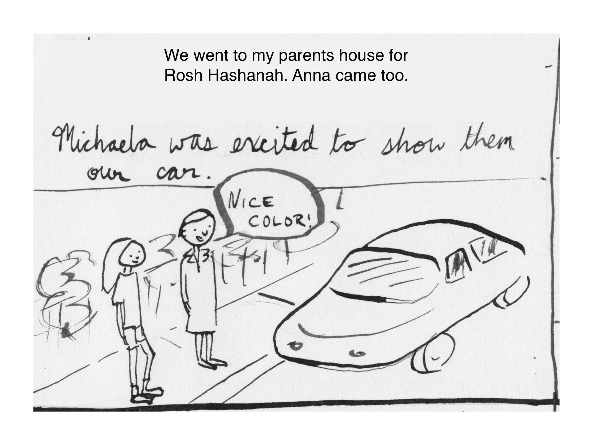 So the day before Rosh Hashanah I asked Michaela if she wanted the honor of picking our lone apple. She did. She picked it, rubbed it against her shorts to give it a shine, and handed it over. I brought it to my parents' house the next evening, where I sliced it and discovered that we'd picked it just in time, that yes, the flesh had begun to rot, and I cut that part out, and we ate the rest, and it was too tart because it wasn't ripe.