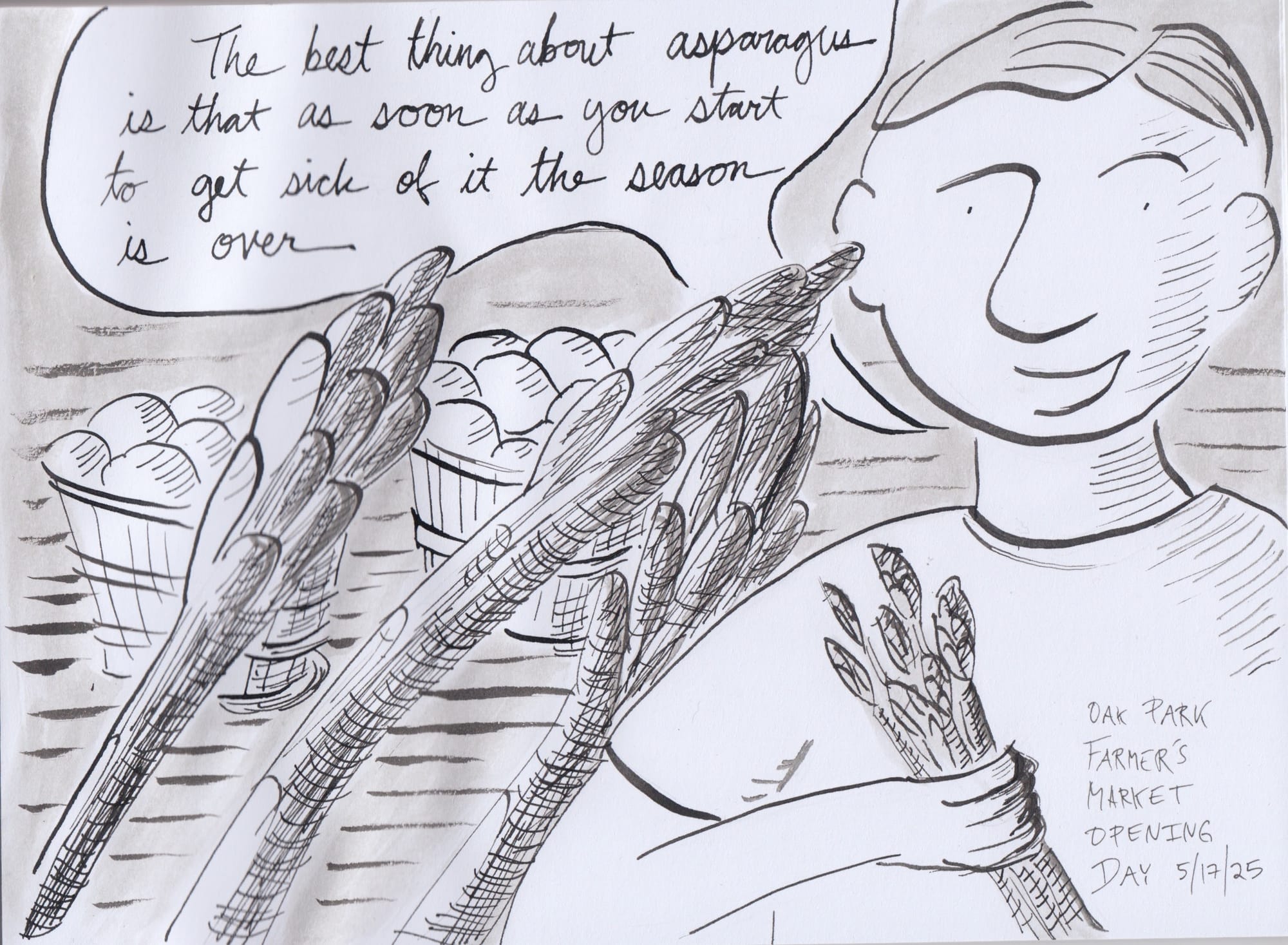 Asparagus was in season, but now it's not, and while we had some delicious asparagus this past week we also had asparagus pee. I was struck by what the vendor at the farmer's market on Saturday said about asparagus: "The best thing about asparagus is that as soon as you start to get sick of it the season is over." I found a lot to disagree with in that statement but I used it as a mantra this week: "As soon as you get sick of X the season is over," it's true of so many things, just give them time. Not most things, I know, not for example the main thing that is wearing everyone out, but still—seasons start, and seasons end. Turn, turn, turn, as Peter Paul and Mary sang.