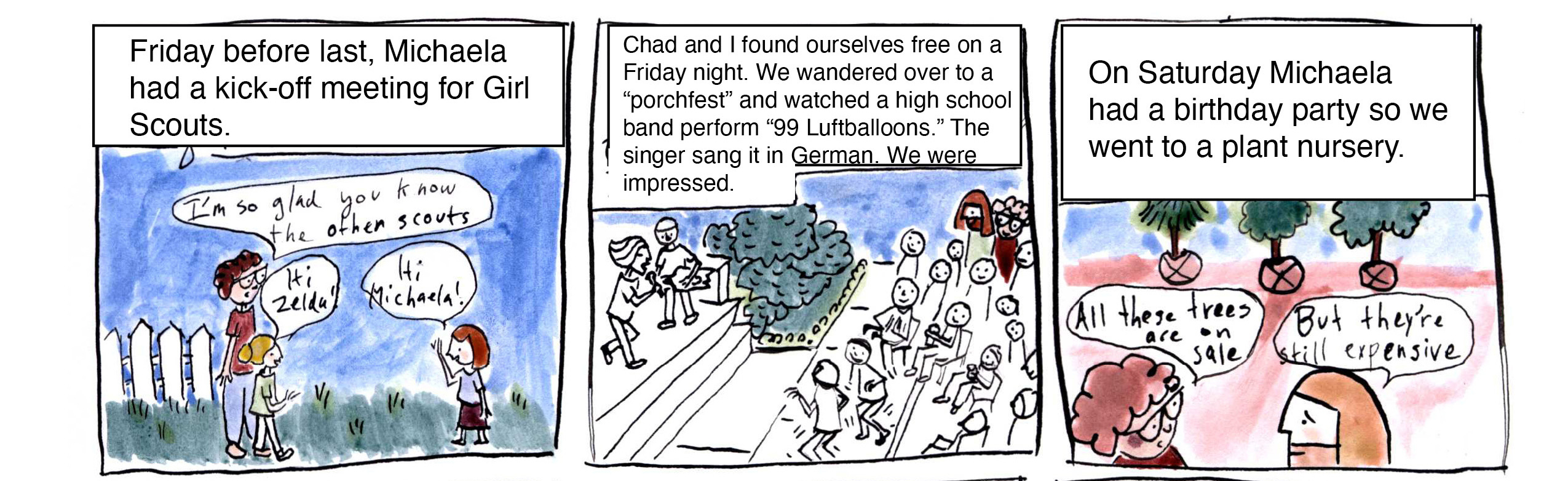Just when we were beginning to have doubts about our move, we had one of those magical nights that affirmed our decision. It was a perfect evening, cool but not cold. We dropped Michaela off at a Girl Scouts meeting where the troop was going to watch a movie in someone’s backyard. I was happy to see that she already knew many of the scouts from her school. Then we strolled over to a porchfest concert (which is as it sounds—when one or more bands performs on someone’s spacious porch) and watched an unusually talented high school band play a set. I think we’re going to like it here.