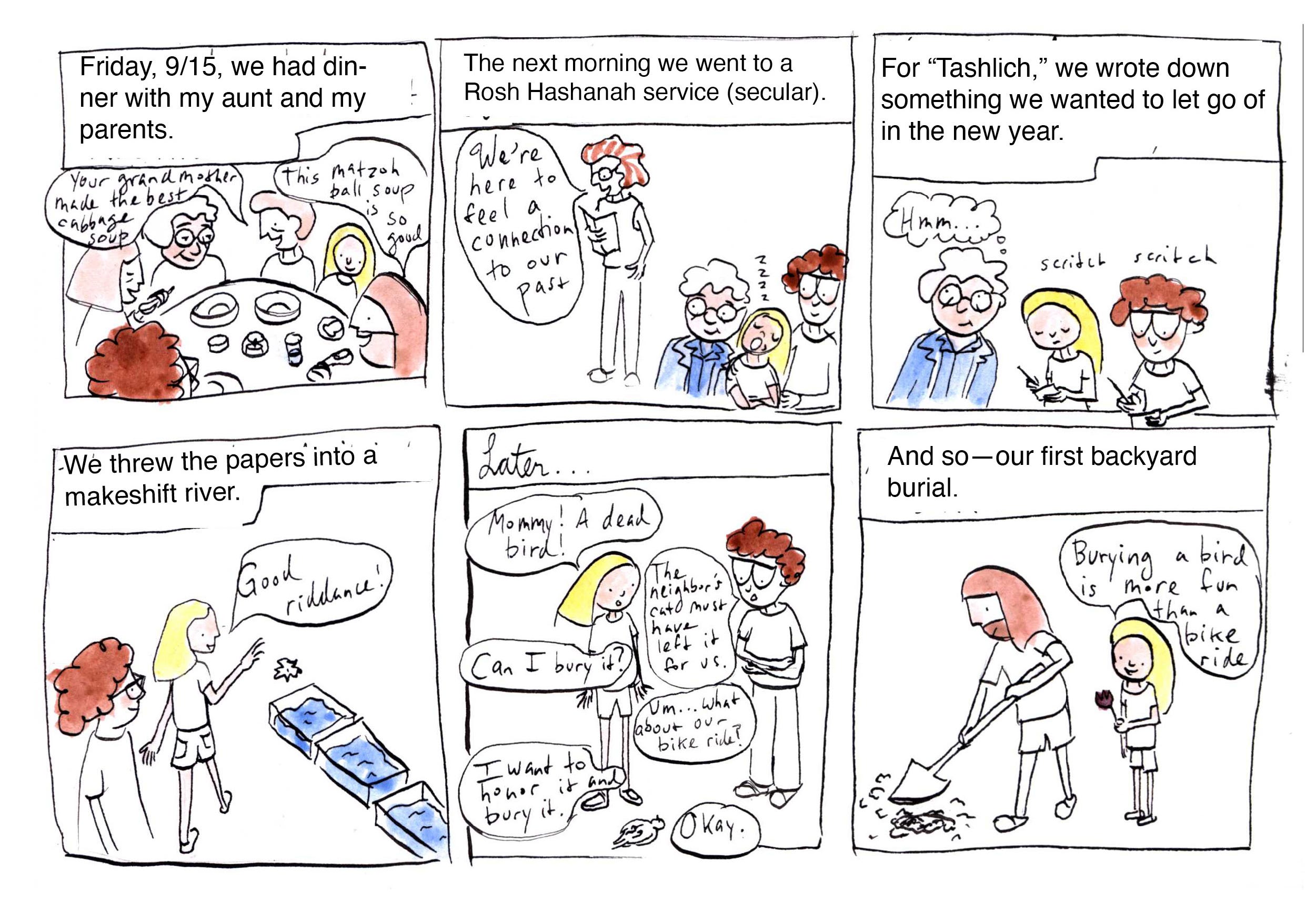 This past weekend was Rosh Hashanah and we had dinner with my aunt and my parents. Michaela, my dad, and I went to a secular service on Saturday morning. Later that day our neighbor’s cat left us an offering, which we disposed of in the appropriate manner.