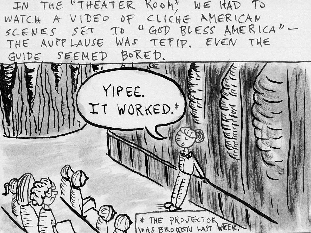 When we got to the "Theater Room," where a truly spectacular geological formation ripples across one wall in a manner that, yes, resembles a stage curtain, we all sat down on bleachers which had been installed for people to sit on. We then watched a video that included scenes of happy families holding hands or running across fields interspersed with shots of a waving American flag while a soprano sang "God Bless America." We may have been underground, but we were still in Missouri, and damned if we were ever to forget it.