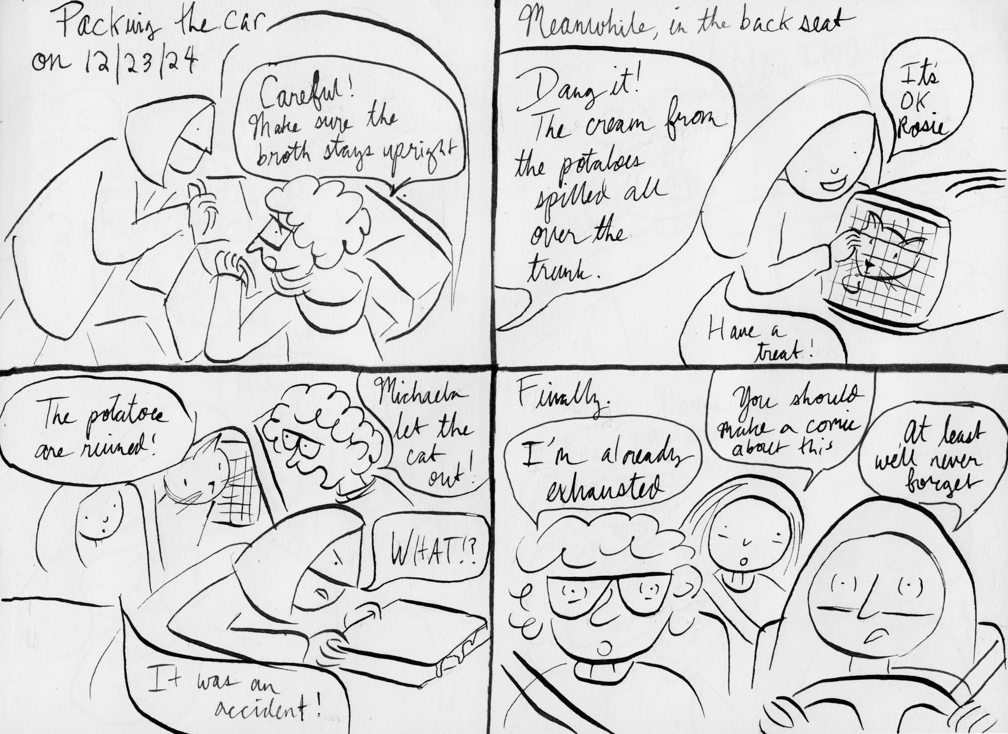 This is a hugely inelegant transition, and possibly also in poor taste, but here's a page from my comic diary about our travails from a few weeks ago when we packed the car for the twenty-minute drive to my parents house for Christmas. It felt like everything that could go wrong, did. But the Hasselback potatoes made it more or less intact and were delicious.