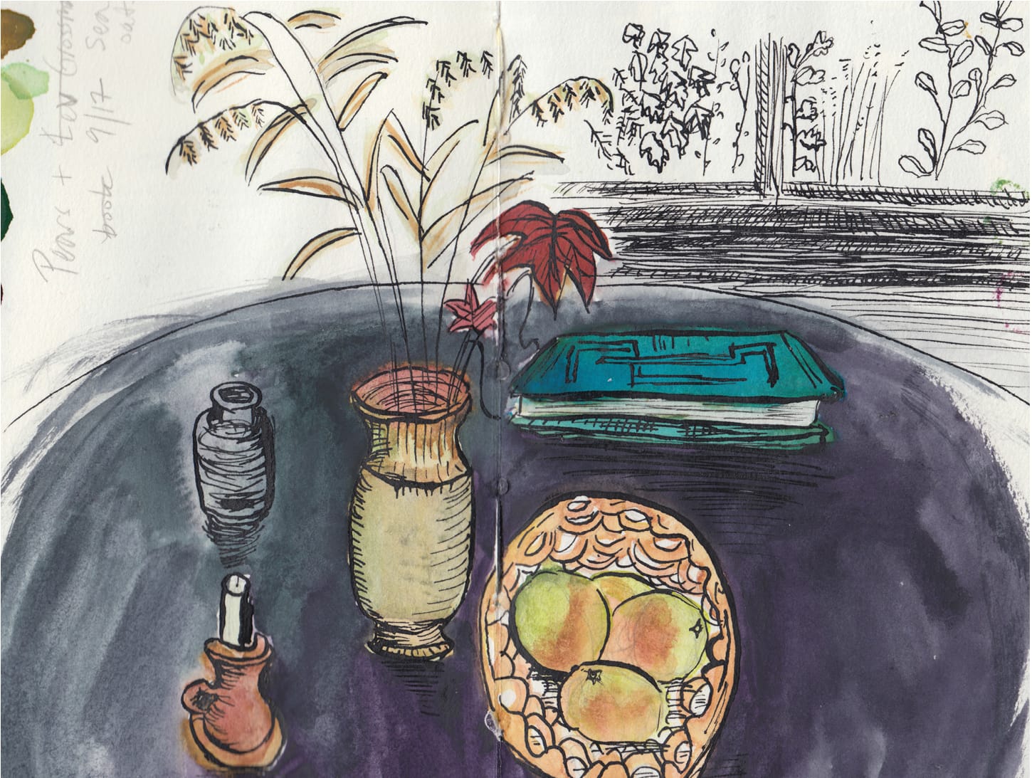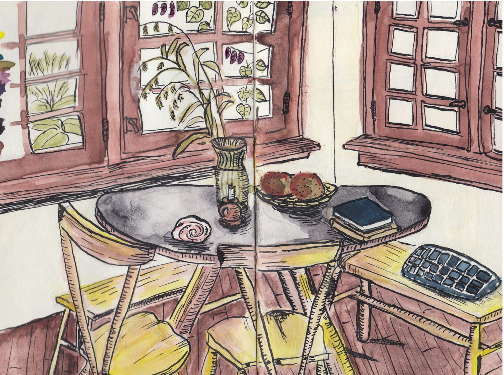 We (ahem, Chad) finally figured out how to use the back sun room. We put the round dining table in there along with some benches and it is a very nice place to have breakfast. Now that the light is changing it's not roasting hot in the afternoon, which means that it is a pretty ideal place to read or work (or draw, see image below) almost any time of the day.