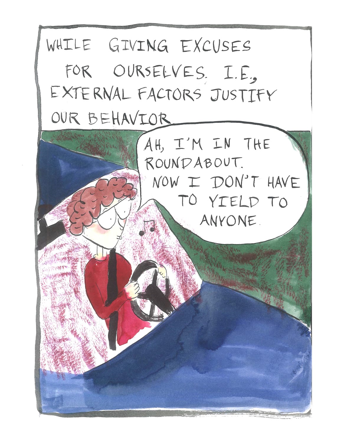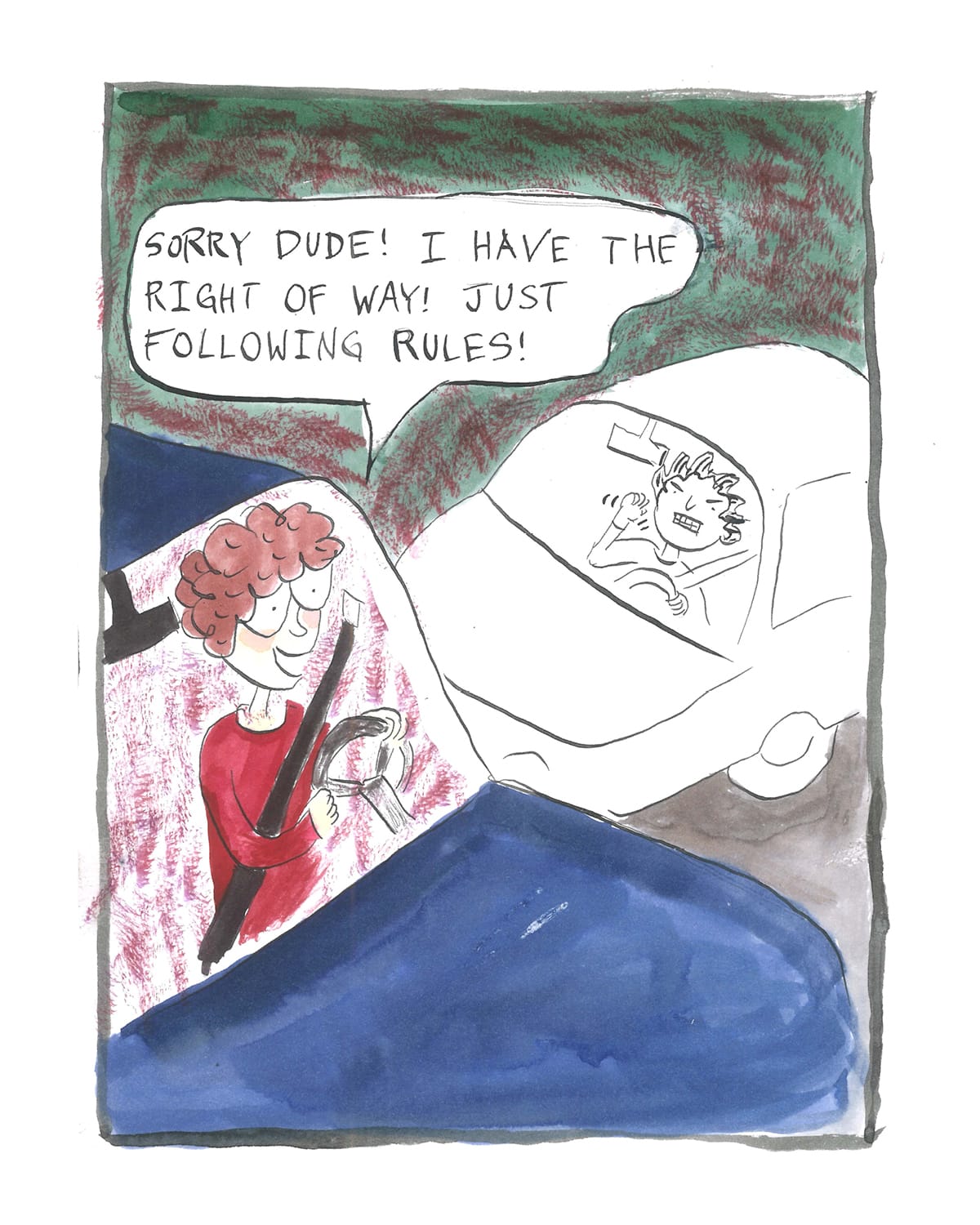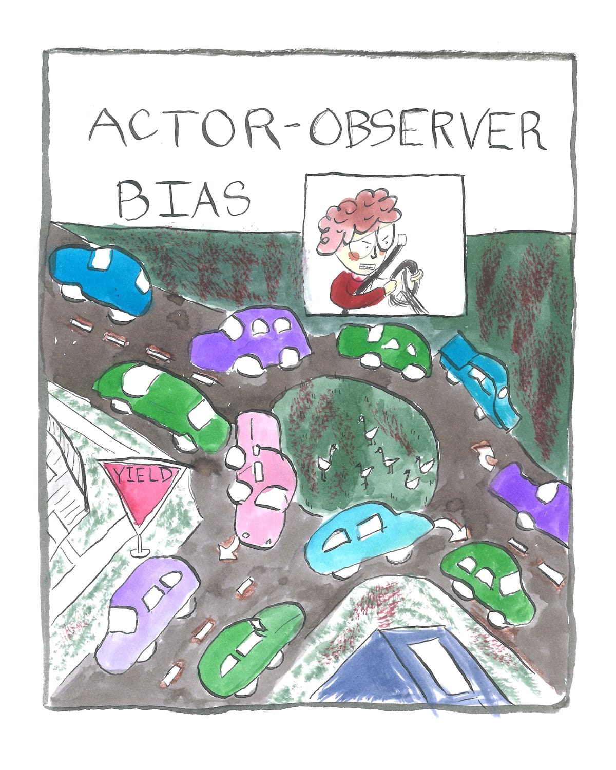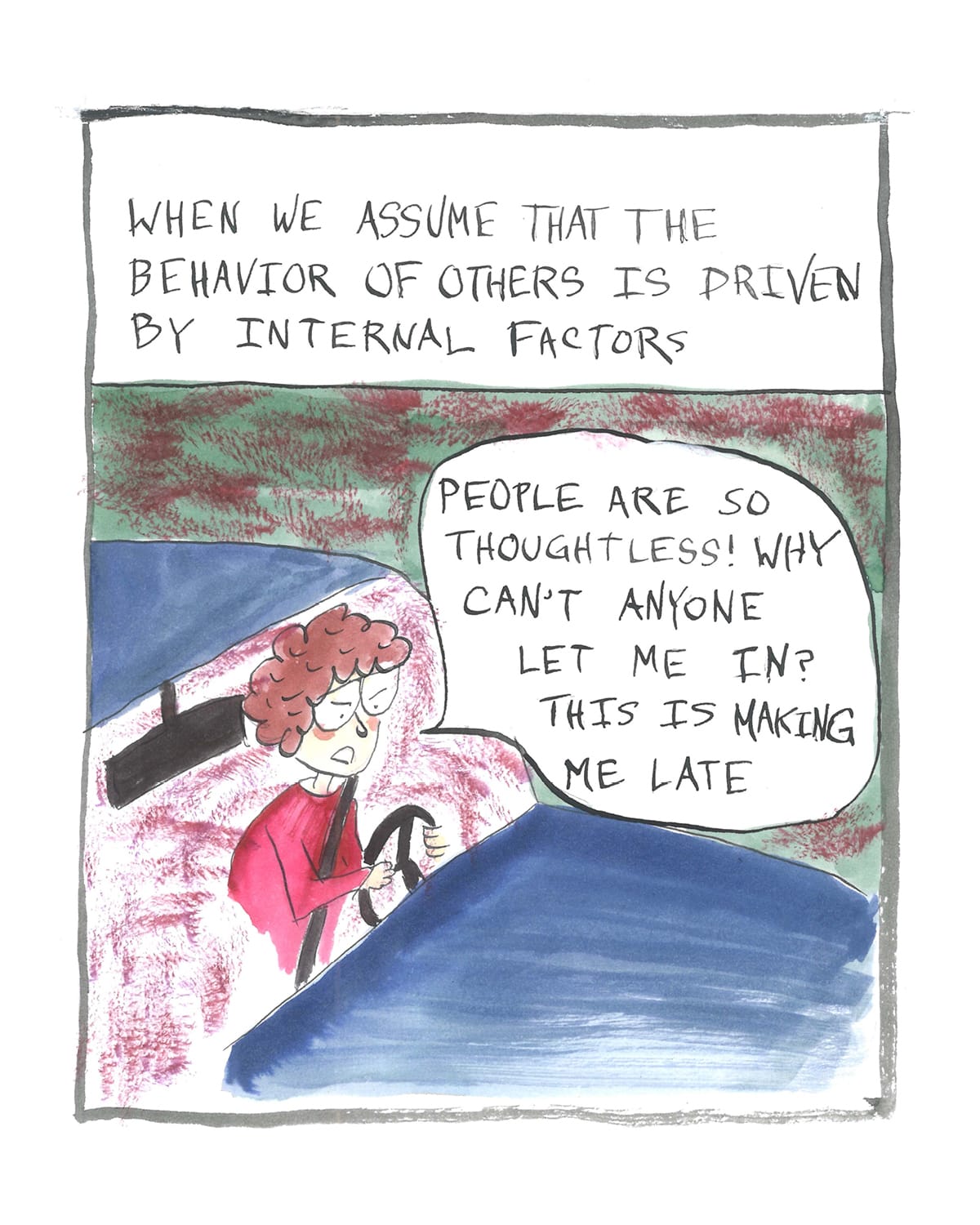 I realize this is extremely random especially coming from a suburban mom who makes comics but please just roll with me for a minute. Once I heard this term I couldn't stop thinking about it and all the ways it affects my perceptions of others. I heard it first in relation to the use of computer animation in courtrooms—if you already know the outcome of a crime, that will color your interpretation of the sequence of events that preceded it. You will assume the perpetrator's personality led them to deliberately make certain choices (like being a meanie who doesn't let other drivers in!) rather than consider any external factors that may have led to the crime.