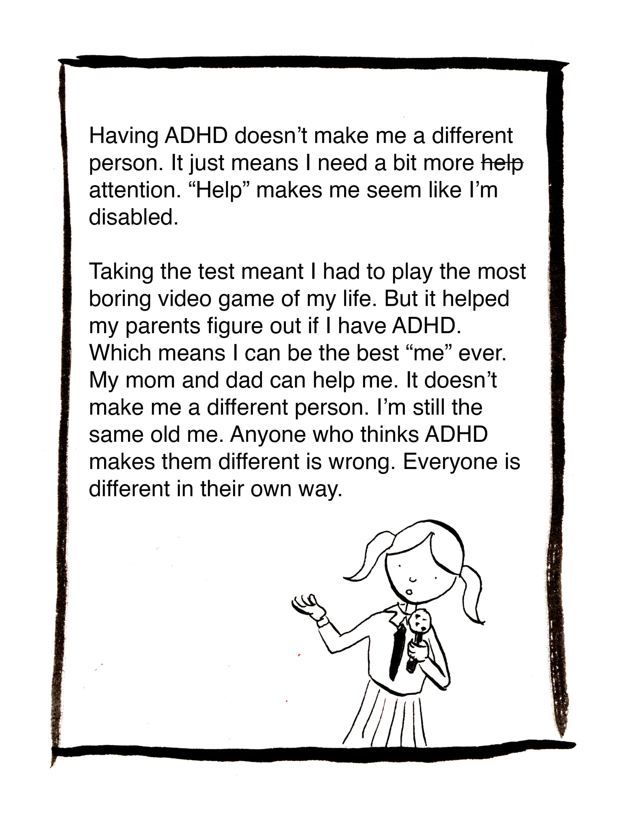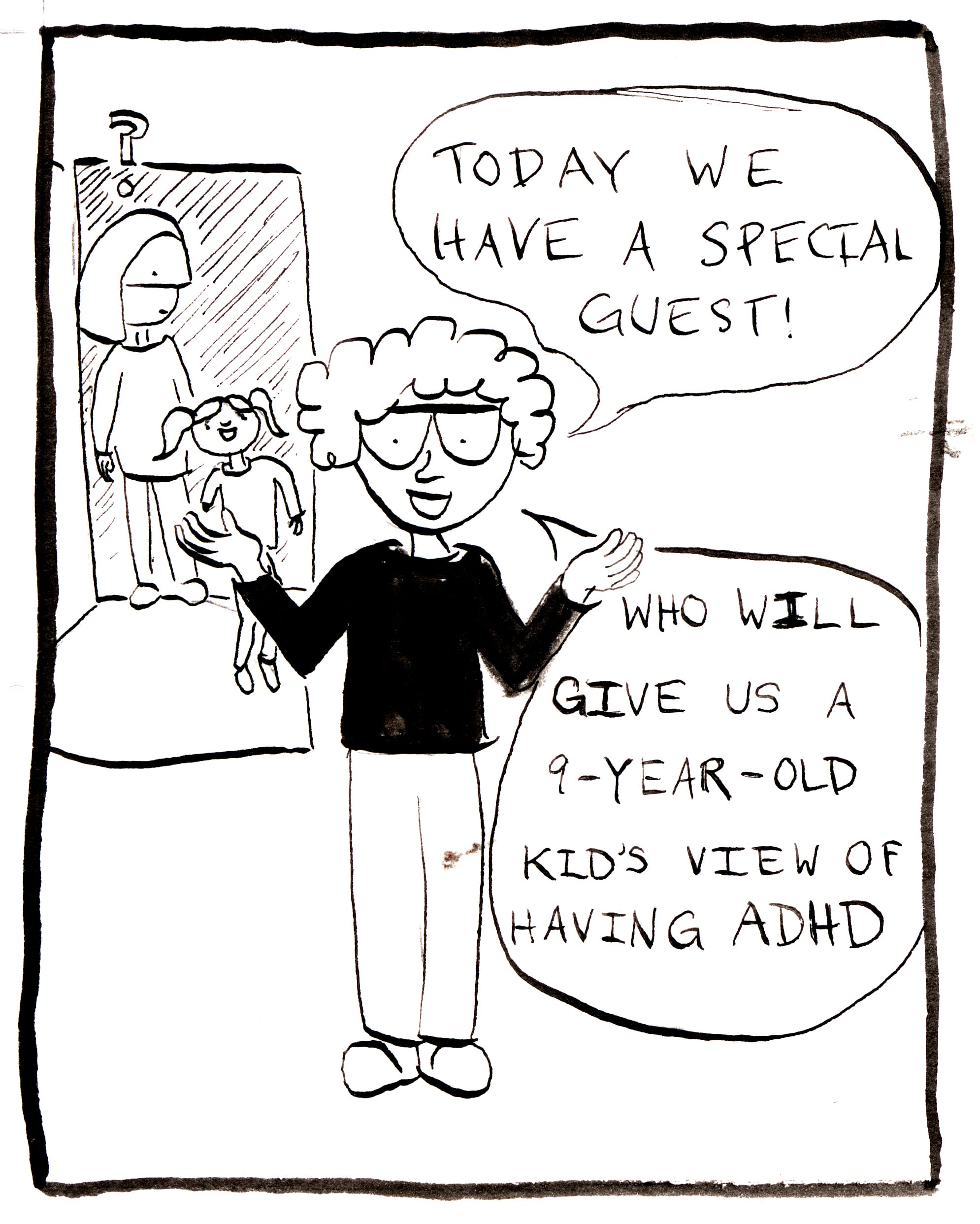 I've been working on a series of comics about having ADHD and having a child with ADHD. Here are the first and second comics. Michaela helped with this one. Actually, she more than helped. It's really her creation. She wrote it and sketched the thumbnail version. I wanted to just use that, but she asked me to draw it. She did draw herself in the first panel, and added lettering to the seventh panel. As you might imagine, when two people with ADHD collaborate, especially when it is a mother and daughter, things can get nutty. I would love to know what you think about this one. First and most importantly: does it even make sense???