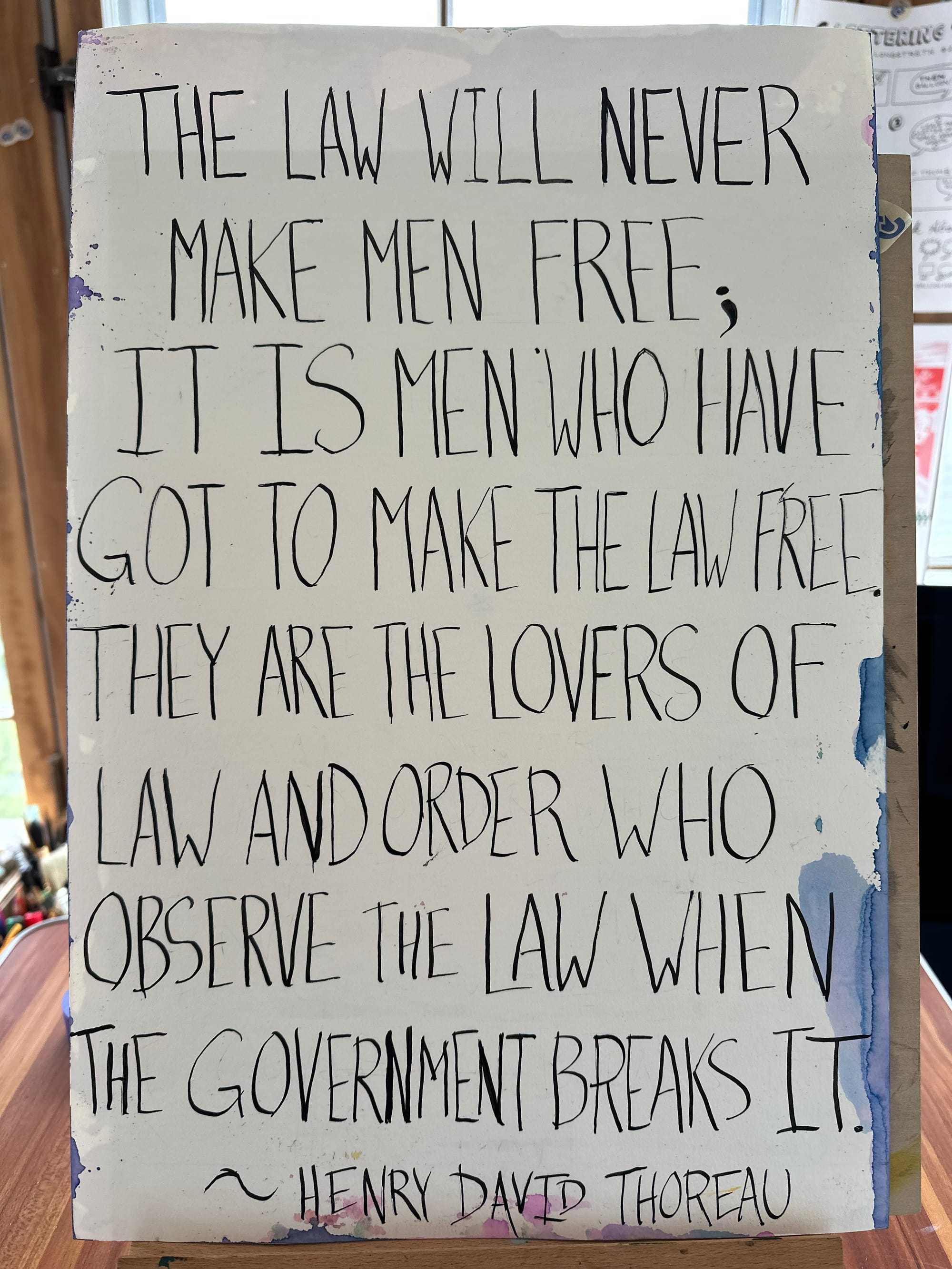 Now I followed Gerry into the crowd at Federal Plaza to find her friend. I could see people reading my sign. I hoped they had time to read the whole thing. We lifted our signs and strained to hear whatever it was the person using a loudspeaker was saying to us. There was a sign-language interpreter, so at least Gabi was able to follow what was being said. I held my sign up high so the people standing behind me could read Thoreau's message from 171 years ago.