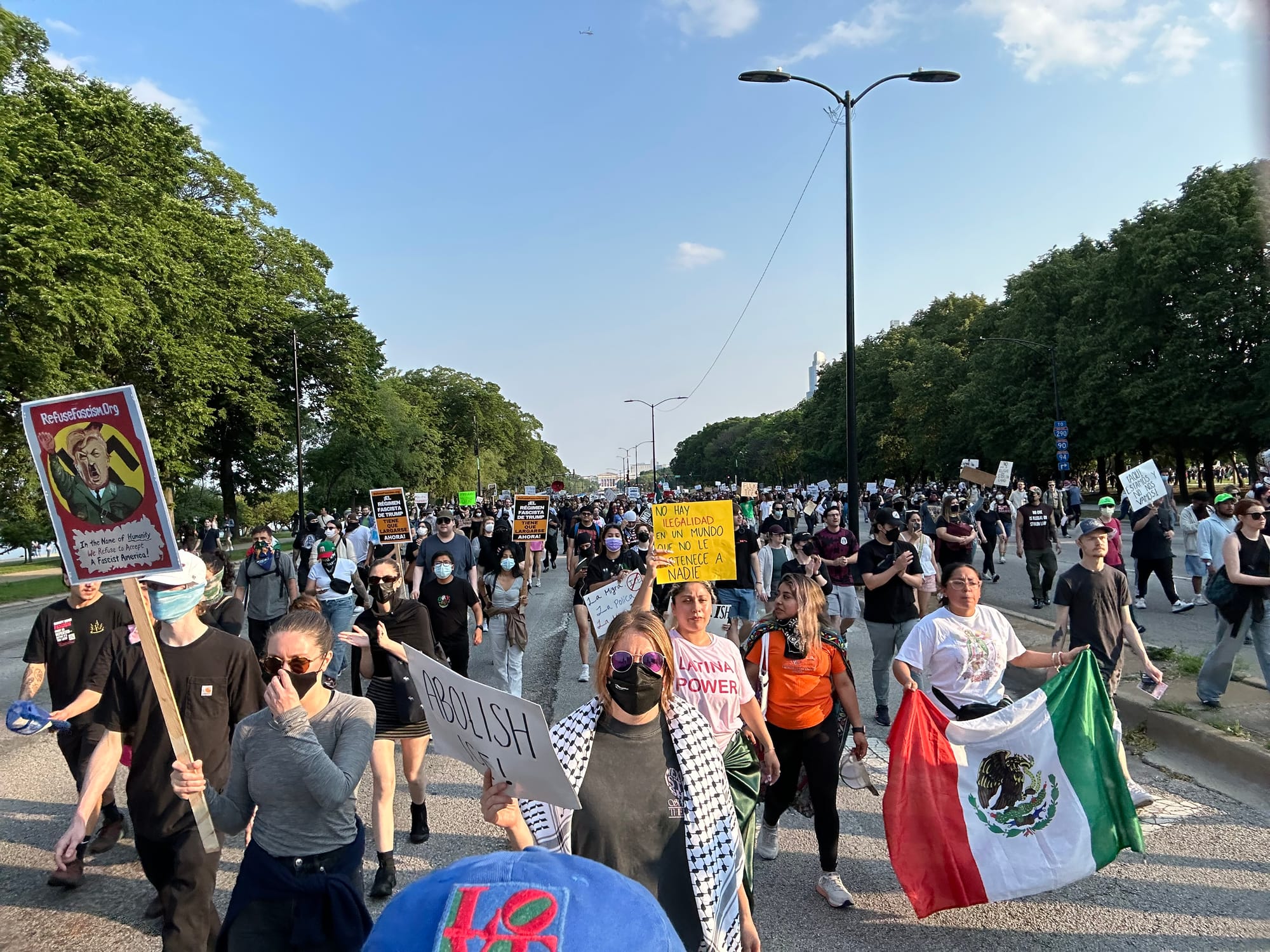 Gerry, along with many other people, began striding toward the street, and signaled for me to follow. We were on the move. I was relieved. Perhaps this would be a little more impactful than "Hands Off." As we stepped off the sidewalk curb onto Dearborn it seemed as though our numbers swelled immediately. Where had these other people come from? I didn't care. I had no idea who was leading us. I had the sense that a significant number of people were falling in behind us. The momentum was powerful. It was dizzying to walk through the Loop, shouting "Fuck Ice!" over and over, and then to turn onto Wacker, and see the shining river, and to shout "Stop Trump; Stop the KKK; Keep fascism out of the USA" or to respond "Our Streets" whenever someone called out "Whose streets?" while people sat in posh restaurants and gaped at or took pictures of us. I was glad I'd worn a bandanna mask. I held my sign up high with the message facing backwards so that the people marching behind me could read the whole thing.