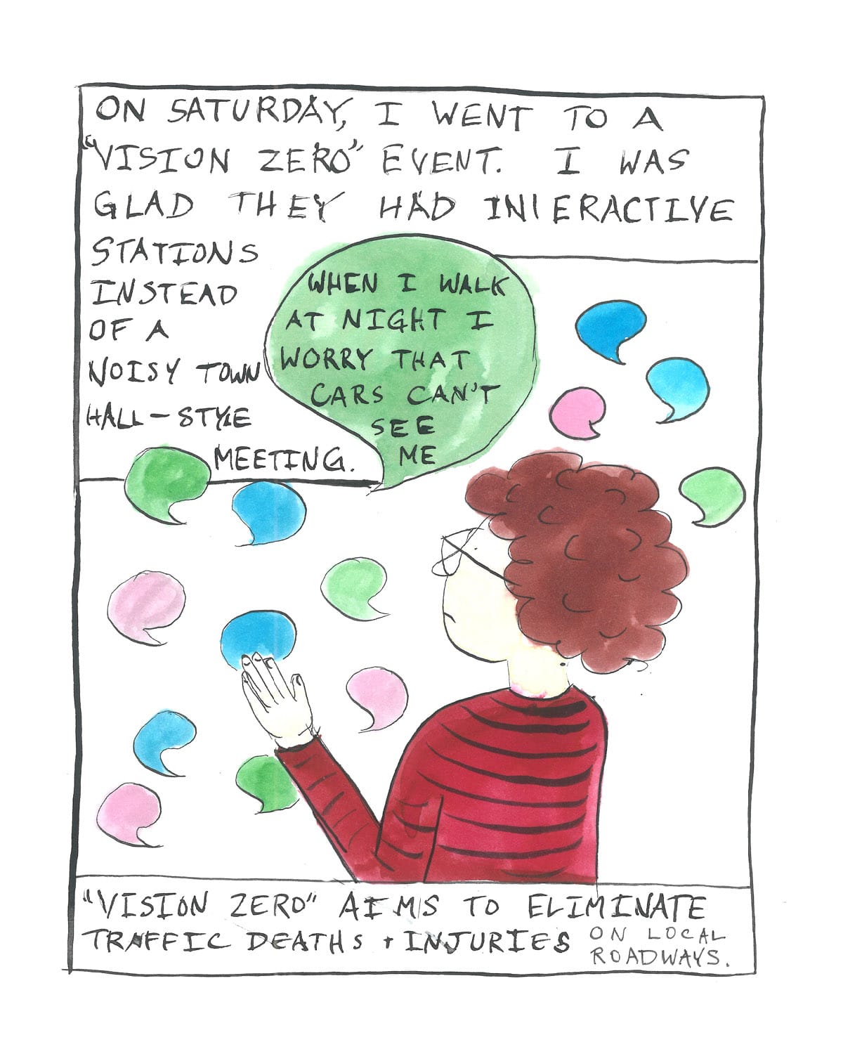 Over the weekend I went to a "Safe Streets Workshop" as part of a "Vision Zero" initiative in the village of Oak Park, where we live. The workshop comprised three stations where people could offer input on making the streets safer—writing your feelings on a post-it note, or putting a sticker on a map to mark a particularly gnarly intersection, or speculating about how Oak Park could make national news through implementing some crucial change.