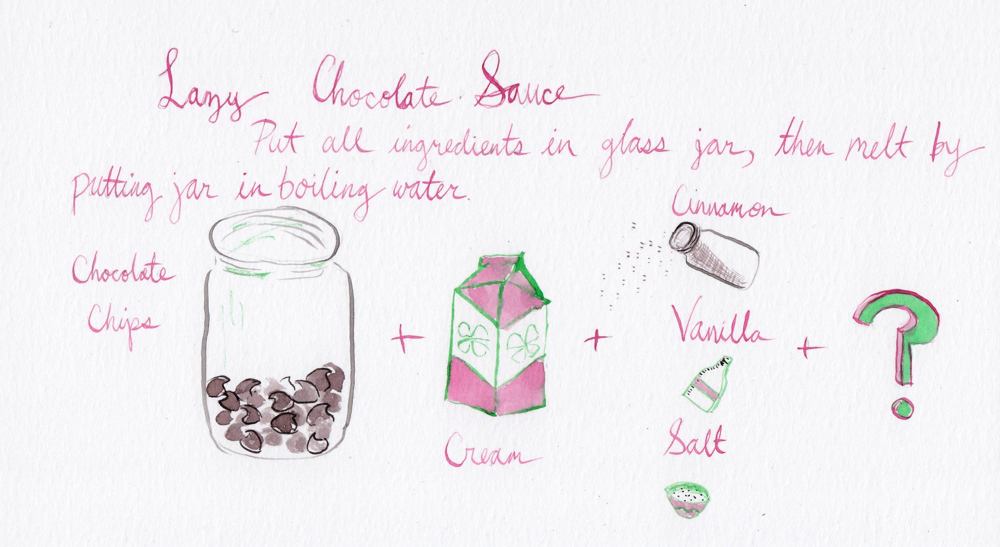 The other thing I made out of necessity was chocolate syrup. What? I craved ice cream with chocolate syrup and I'm too much of a snob to use the Bosco that's been sitting in our fridge for five months. Again, I did use a recipe for reference, but only to find out whether it was possible, as I imagined, to just heat up chocolate chips with dairy and call it a day. I filled a glass jar with about a quarter cup of chocolate chips, added some cream and half-and-half, and put the jar into a saucepan filled about a third of the way up with water and let the water boil around it, double-boiler style. Then I rummaged the kitchen for other ingredients to put into the jar: cinnamon, a splash of vanilla, salt, coconut oil. I stirred everything together, and voila, I had chocolate syrup already in a storage container, and no additional dirty dishes; I just rinsed out the pan and put it on the drying rack. This stores well in the fridge and you can just eat it with a spoon straight out of the jar which is what I did yesterday afternoon.
