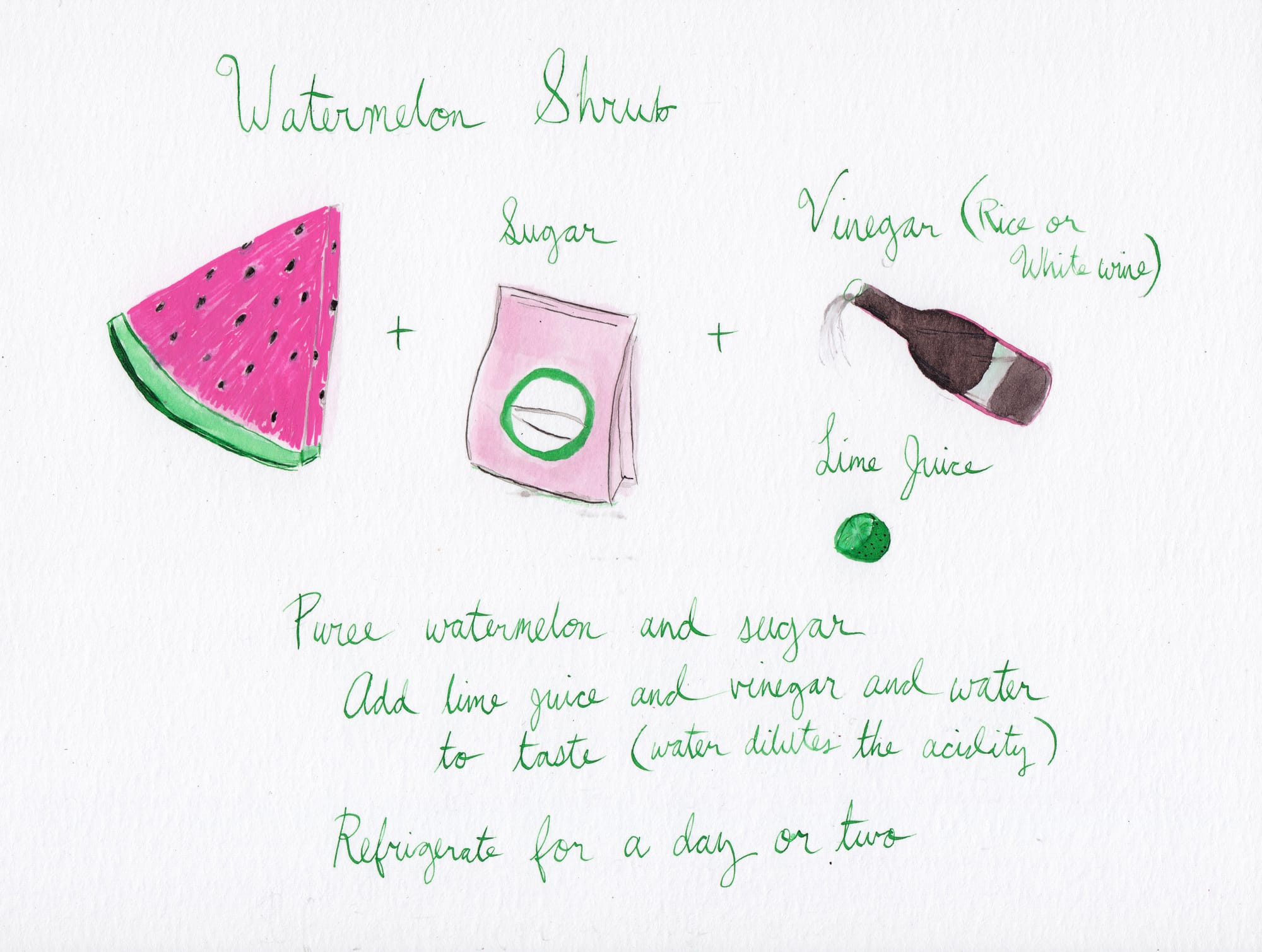 Michaela's Secular Jewish Sunday School teacher taught the class traditional recipes from different countries for Passover, and one of them was a Persian cucumber/vinegar drink which is so easy and delicious I have started making it on the regular. In the summer we eat a lot of watermelon and sometimes have more than we need so I wondered if watermelon would also work well with vinegar. I googled it and lo, it is a thing. I did use this recipe as a guide, but improvised the ratio. I made the simple syrup but in future I think I will just mix the sugar in with the fruit and vinegar since the acids will dissolve it anyway. What I like about this recipe is that you don't discard the fruit. It all just stays mixed together. I strain it when adding it to club soda, but that's it. I used a blender to puree the melon but you could just smash it with a ladle. Tart and sweet, though it does mellow over time.